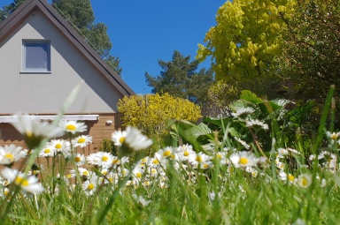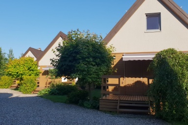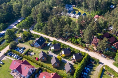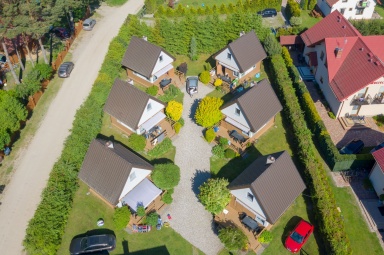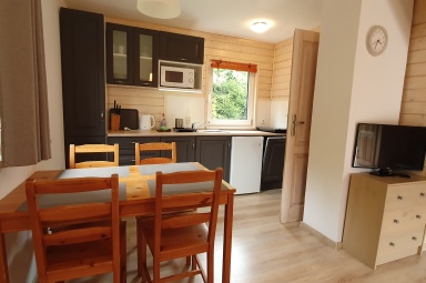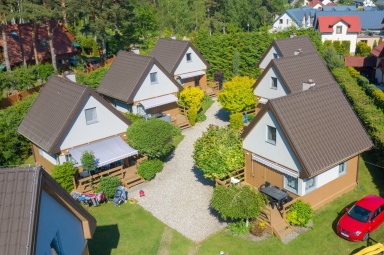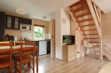 6 domów drewnianych (do 8 osób każdy) o powierzchni całkowitej 59m2 (salon z aneksem kuchennym i łazienką, na piętrze dwie sypialnie) . Przed domkiem taras z zestawem mebli ogrodowych osłoniętych markizą