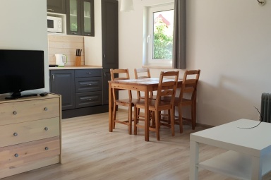 Kuchnia: zlewozmywak, kuchenka elektryczna,zmywarka, lodówka, mikrofalówka, czajnik elektryczny, garnki, zestaw naczyń i sztućców dla 8 osób